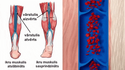 Šī saraušanās atver venozos vārstus un izspiež vecās, sastāvējušās asinis pareizajā virzienā, pretēji gravitācijai.